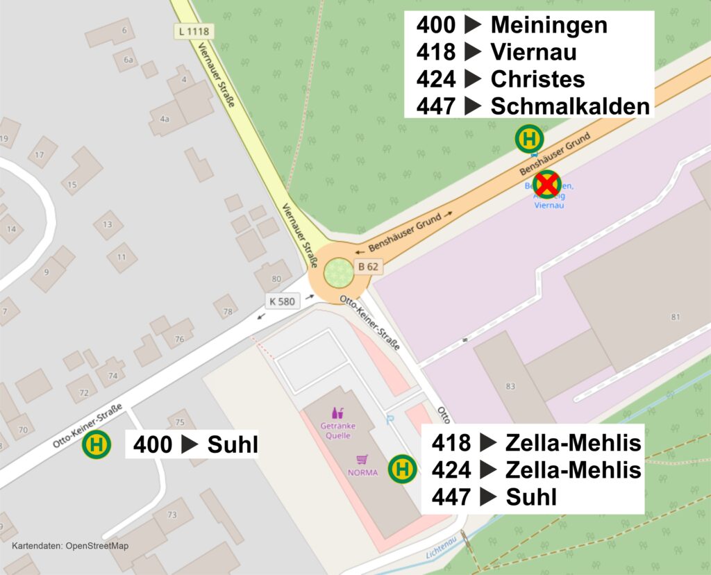 aufgrund des geplanten Neubaus der Haltestelle Benshausen Abzweig Viernau (in Richtung Zella-Mehlis) kommt es zu temporären Einschränkungen und einer Verlegung der Haltestelle. Wir bitten um Ihr Verständnis für die notwendigen Maßnahmen und die daraus entstehenden Beeinträchtigungen