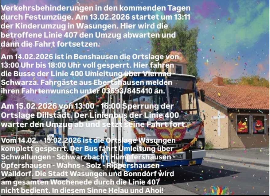 • Linie 407: Der Ort Wasungen und Bonndorf wird am gesamten Wochenende von der Linie 407 nicht